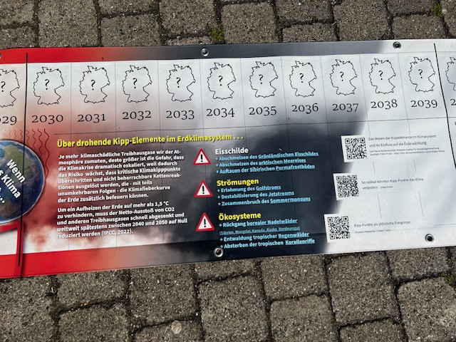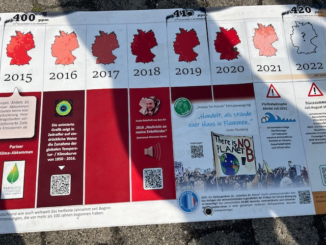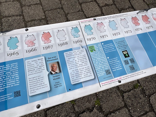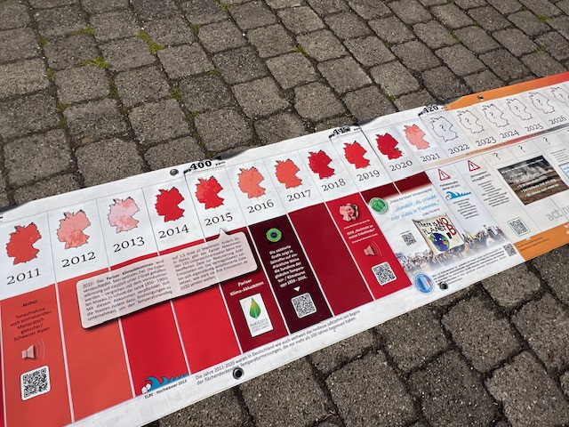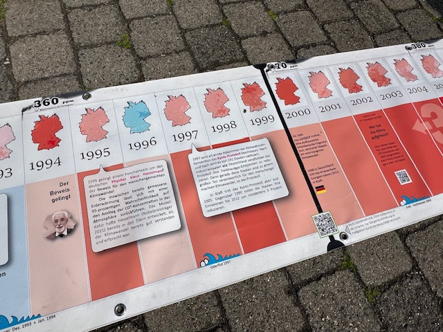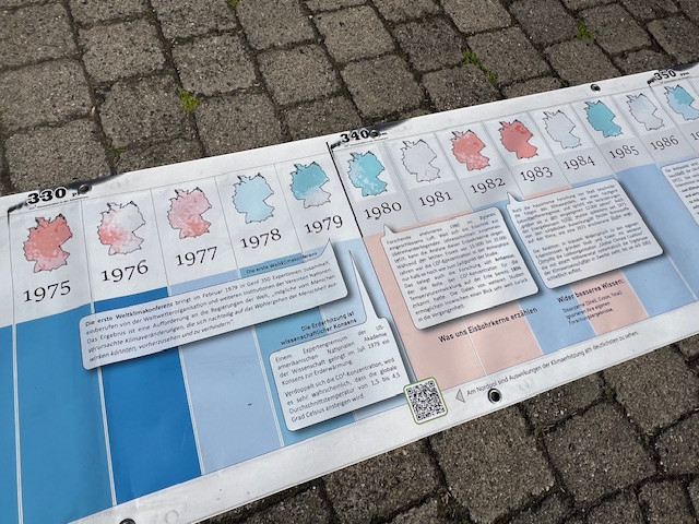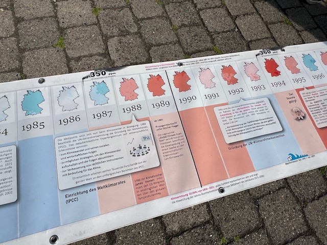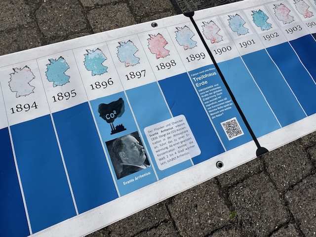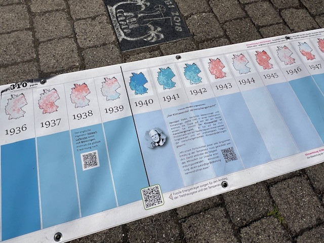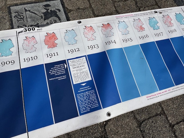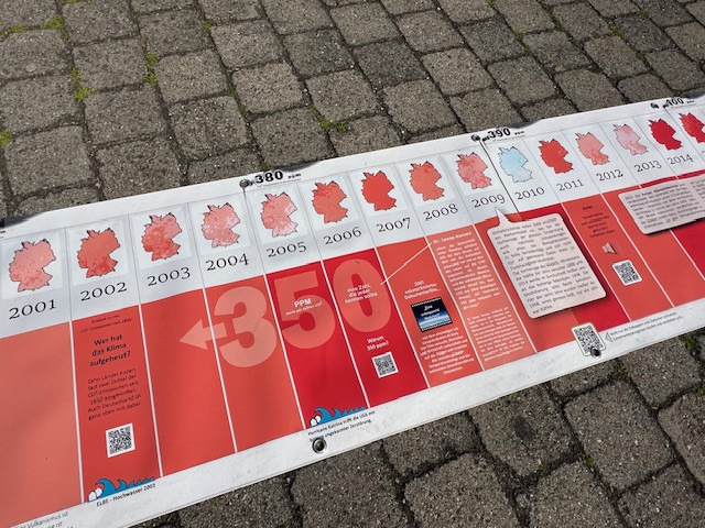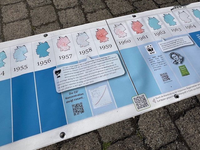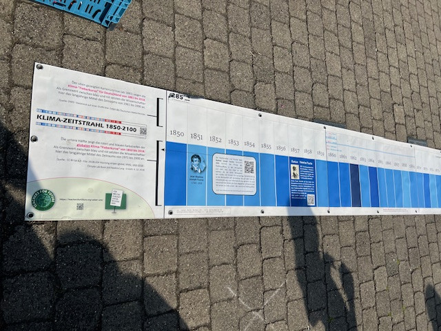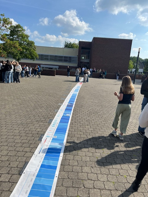 Am Freitag den 07. Juni konnte in den großen Pausen auf dem Schulhof ein 27m langer Klimazeitstrahl erkundet werden. Das Bodenbanner zeigt blaue und rote Jahresstreifen, die sogenannten warming stripes, die der britische Klimawissenschaftler Ed Hawkins entwickelt hat, um die fortschreitende Erderhitzung mittels einer Farbskala verständlich und anschaulich zu machen. Anhand des Verlaufs von blauen zu roten Streifen wird sofort begreiflich, wie rasant die durchschnittliche globale Temperatur von 1850 bis 2018 – besonders in den letzten drei Jahrzehnten – angestiegen ist. Ganz kurzfristig wurde uns der Zeitstrahl vom Fairtrade Verein Telgte zur Verfügung gestellt. Wir sagen herzlichen Dank.