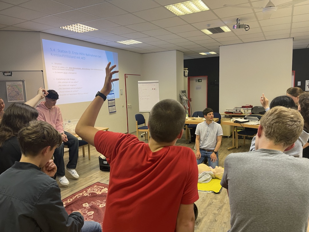 In Notfällen Erste-Hilfe leisten! Das war das Programm des Schulsanitätsdienst unserer Schule. Die 19 Mitglieder nahmen am vergangenen Freitag von 8:00 Uhr bis 15:00Uhr an der Ersthelfer Ausbildung teil, die von Herrn Achtelik durchgeführt wurde. Neben der Theorie über Verhaltensweisen bei Unfällen und kritischen medizinischen Notständen, führten die Schülerinnen und Schüler ebenfalls Fallbeispiele durch. Dabei lernten sie das Abnehmen von Motorradhelmen nach Unfällen, Verbände zu wickeln und die Betreuung von Asthma- und Krampfanfällen. Abschließend plante die Gruppe gemeinsam im Plenum den weiteren Ablauf des Schulsanitätsdienstes. Im Vordergrund stand dabei das Strukturieren des Einsatzplans unter den Schüler*innen und der Bestand des Sanitätsrucksacks.