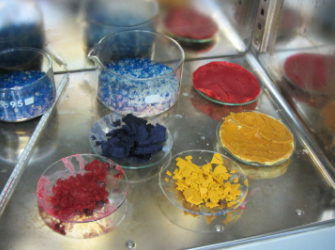 Experimente mit Farben: Zuerst stellten wir Farbstoffe selbst her, indem wir Bestandteile einiger Pflanzen (in meinem Falle die Krappwurzel) in einer siedenden Alaunlösung kochten, dann die Flüssigkeit mit einer Vakuumpumpe absaugten, anschließend zur Farbstofflösung eine Lösung aus Natronlauge und