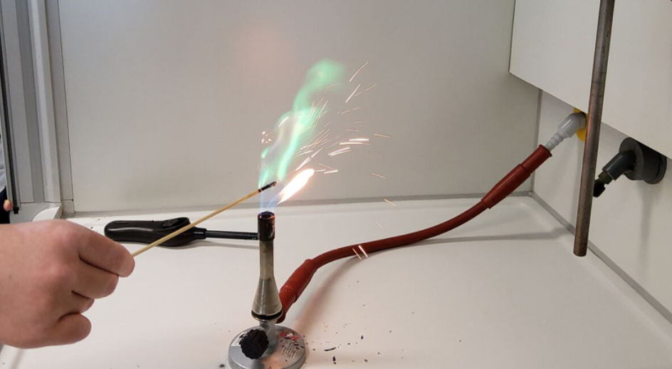 Stoffe färben: Wir hielten verschiedene Metalle wie Kupfer (Bild 4) oder Eisen in die Flamme eines Bunsenbrenners und erhielten grüne, rote, oder auch gelbe Feuerwerke. Wir fanden heraus, ob Chlorophyll ein reiner Farbstoff ist, indem wir auf Kieselgel-Papier mit Chlorophyll ein Laufmittel gaben. Schritt für Schritt setzten sich die Farben braun, grün, hellgrün, gelb, grau und noch einmal gelb ab.